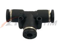 Применение: Широко используется в пневматических системах, где требуется распределение потока воздуха или жидкости на три направления, что может быть полезно для подключения нескольких элементов к одной системе. Т-образные фитинги особенно полезны в автоматизированных установках, производственном оборудовании и других приложениях, где важно минимизировать вес и обеспечить гибкость системы.